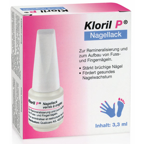 Zur Anwendung auf Fuss- und Fingernägeln bei Schäden durch mikrobiologische, physikalische und chemische Ursachen. Kloril Nagellack bildet auf dem Nagel einen schützenden Film und stabilisiert die Nagelstruktur. Kloril Nagellack enthält Hydroxypropylchitosan, Ethanol, Wasser und Piroctone Olamine (Octopirox). Hydroxypropylchitosan ist ein wasserlösliches Polymer natürlichen Ursprungs, das sich mit dem Keratin der Nagelplatte verbindet. Nachdem der Alkohol verdunstet ist, bildet sich auf dem Nagel ein Film. Der unsichtbare und geruchlose Film schützt den Nagel und fördert sein physiologisches Wachstum. Kloril Nagellack dringt in den brüchigen, unebenen Nagel ein und stabilisiert die Nagelstruktur. Ausserdem wirkt er als Barriere gegen mikrobiologische, chemische und physikalische Einflüsse. Er ist daher besonders geeignet um eine Ausbreitung des Nagelpilzes